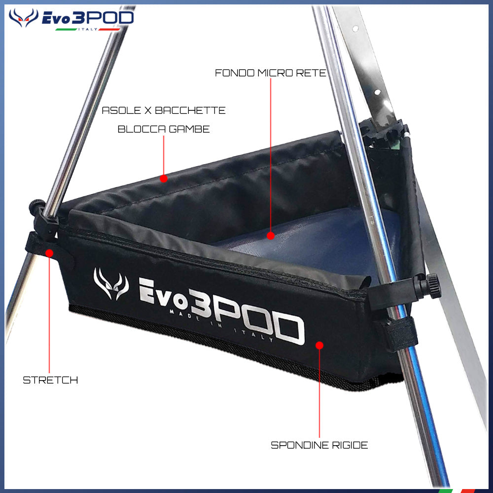 Inoltre l'originale Serbidora Triangolare Evo3POD è dotata di 3 asole superiori perimetrali studiate per adattarsi ai braccetti lunghi in alluminio del blocca gambe Creando un unico Doppio Accessorio: Blocca Gambe Stabilizzatore con serbidora incorporato.