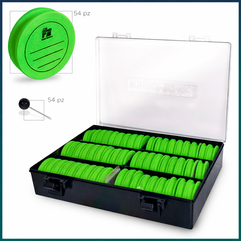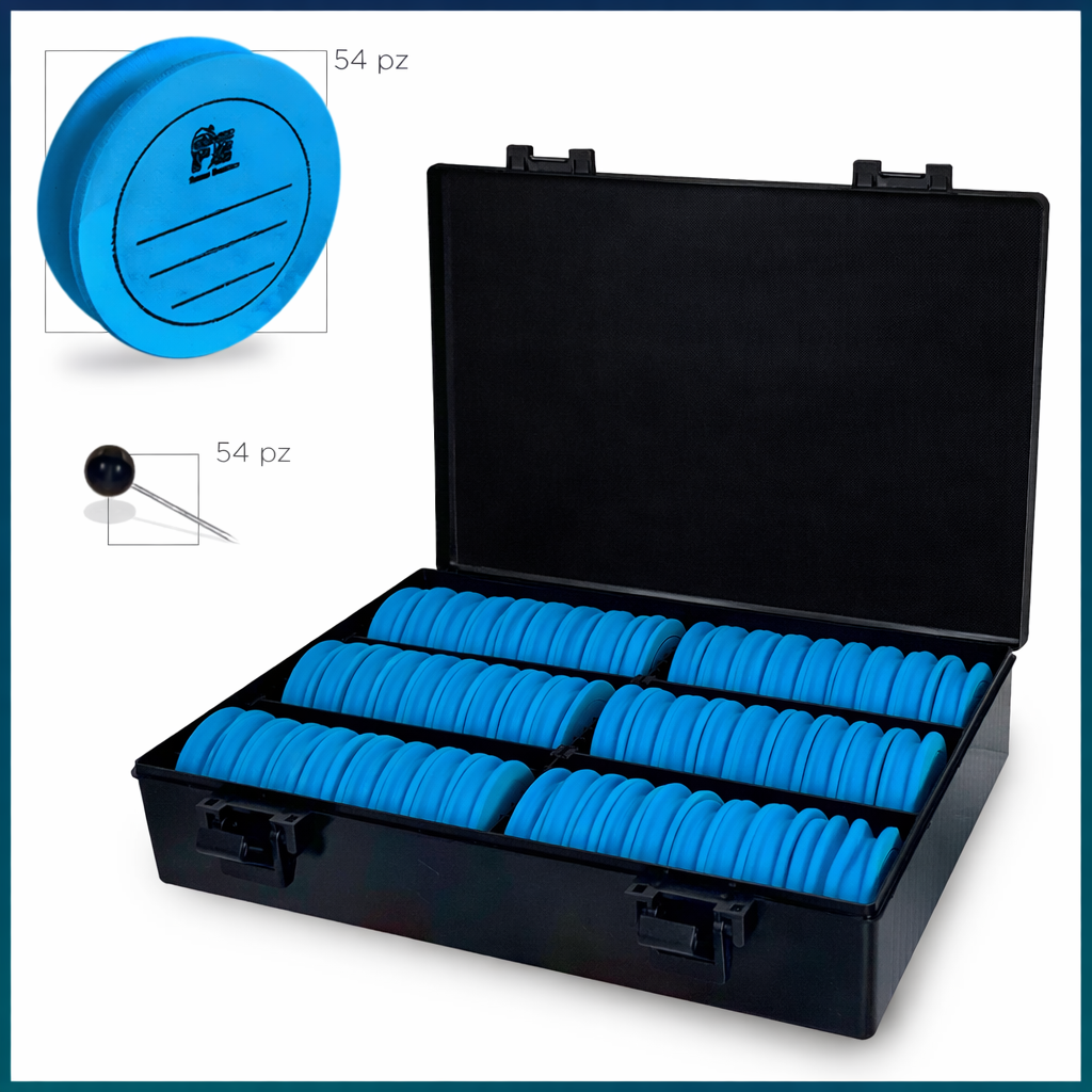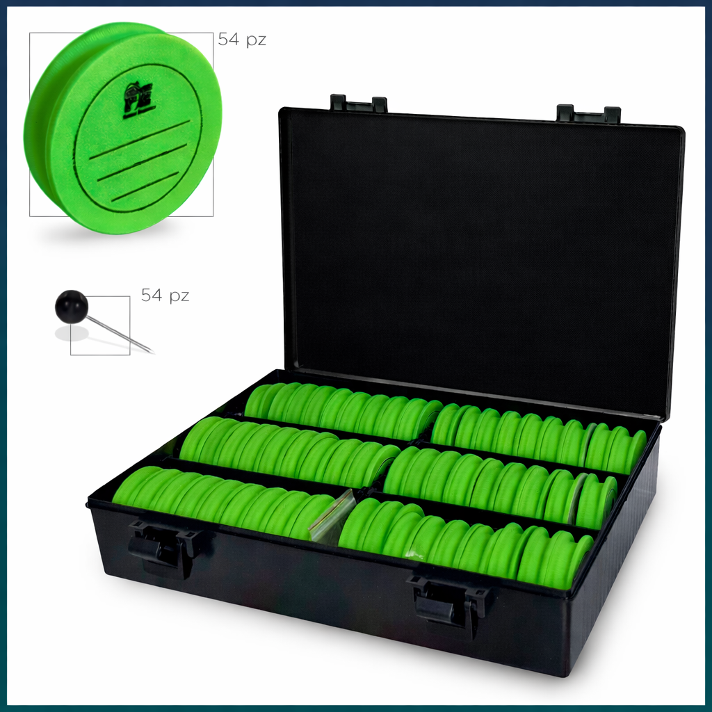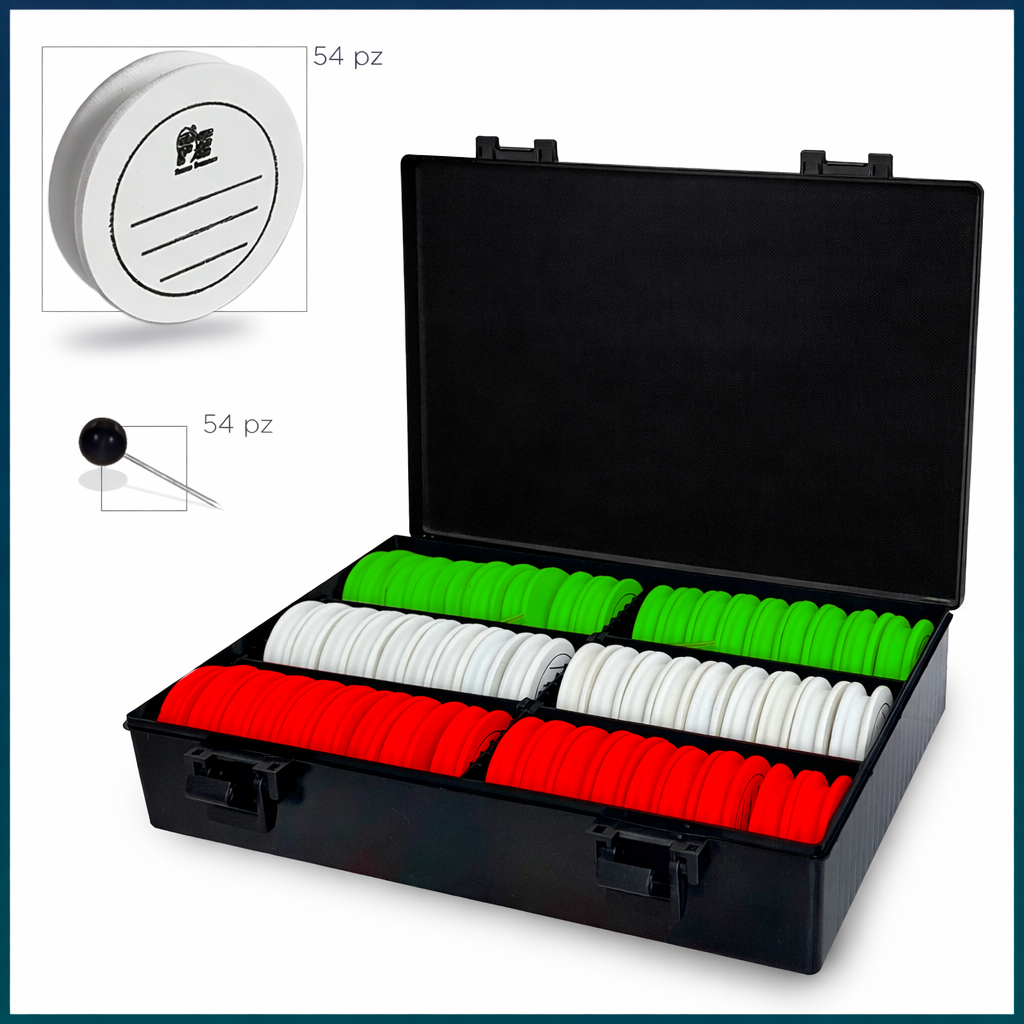 La scatola porta ruzzole migliore che sia, corredata ora con 54 delle nuove RUZZOLE della misura 65x17mm e di 54 spillini